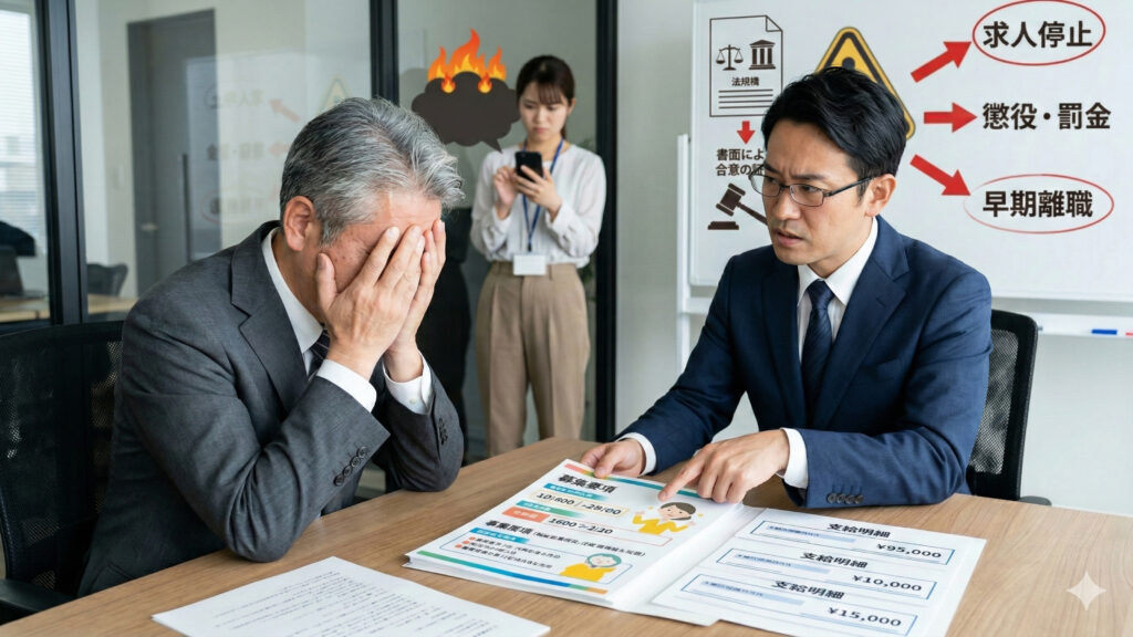 結論から申し上げますと、この問題を解決し会社を守るには「職業安定法・労働基準法に完全準拠した求人票の作成と、入社前の『労働条件明示・合意プロセス』の徹底」が不可欠です。