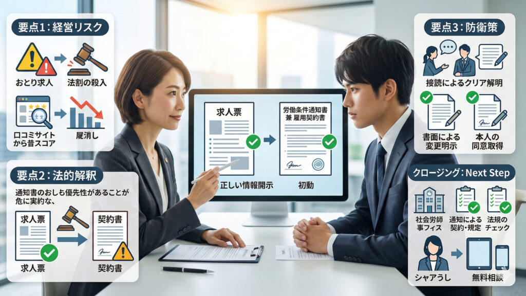 面接等で条件を変更する場合は、入社前の「書面による変更明示」と「本人の同意取得」が会社を守る最大の武器になる。