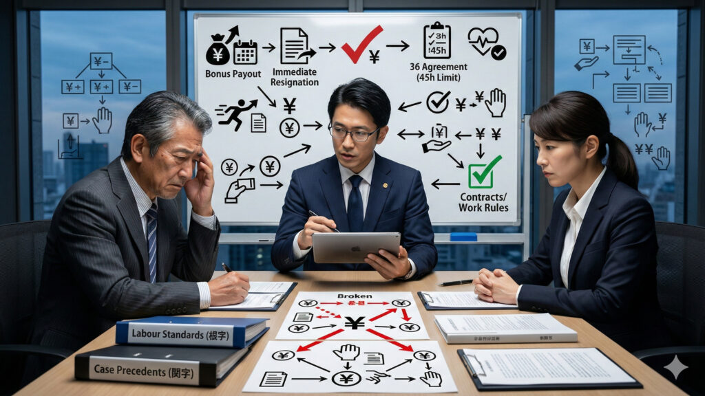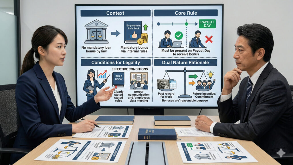 法律・判例に基づき、就業規則へ「支給日在籍要件」と「退職予定者の減額条項」を明記し、全社員に周知するという論理的な運用が必須
