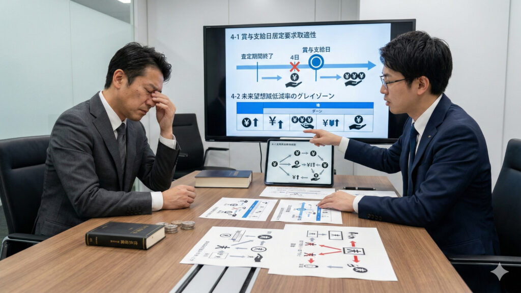 裁判所は「会社が意図的に支給日前に退職(解雇)させ、賞与の支払いを不当に免れようとした」と判断し、信義則違反として賞与の全額支払いを命じるケースが多いのです。退職勧奨を行う際は、賞与の支給時期との兼ね合い(解決金への上乗せ等)を慎重に設計する必要があります。